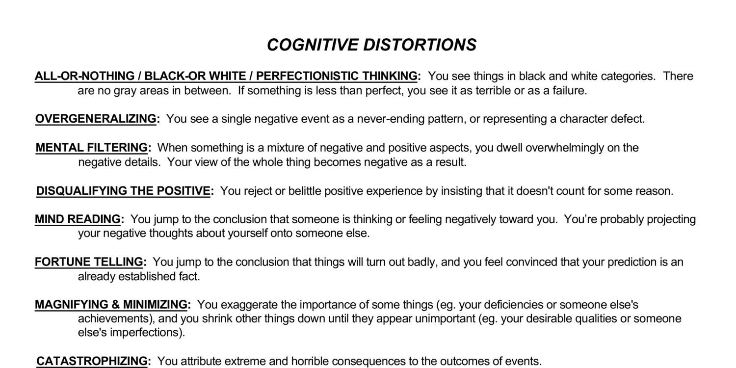 Often clients struggle to understand the meaning behind concepts in cbt, so it is helpful to have a visual aid that explains the … Cognitive distortions are irrational thoughts that have the power to influence how you feel. Everyone has some cognitive distortions—they're a normal part of being human. We will be glad to assist you. One common type of cognitive distortion is called catastrophizing.
